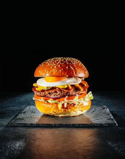 100% wołowiny/ bekon/jajo/ sałata lodowa/ cebula/ pomidor malinowy/ ogór kiszony/ american sos