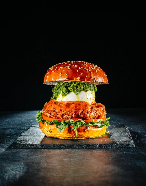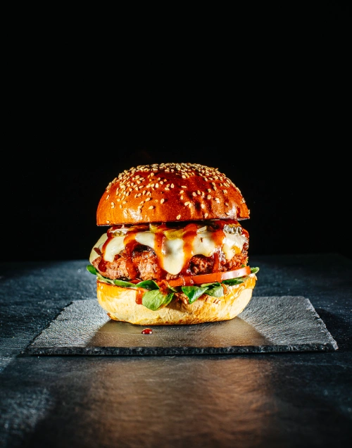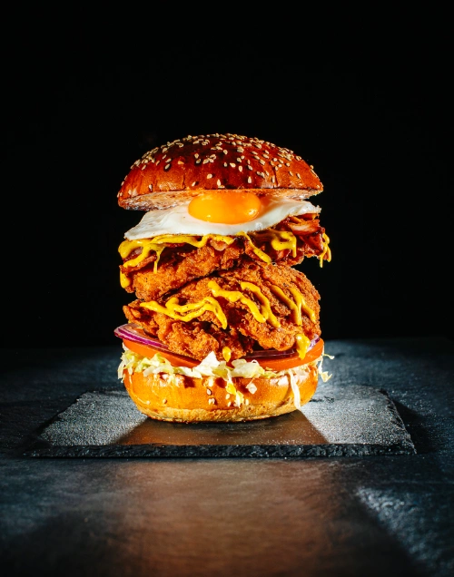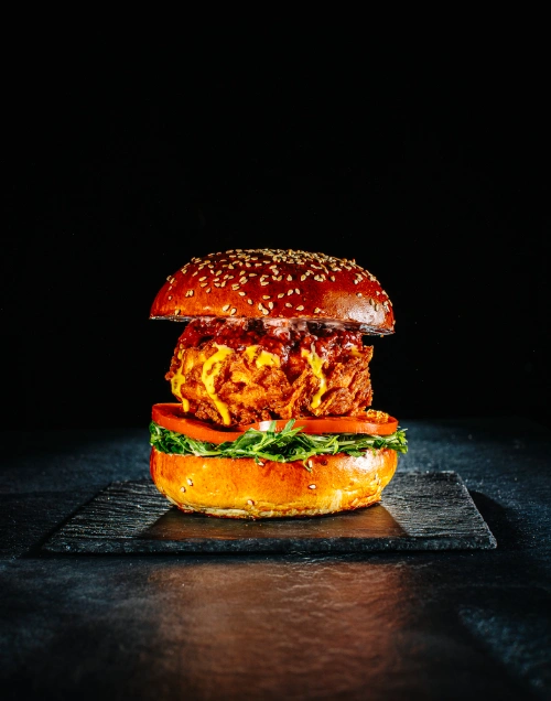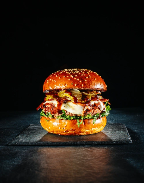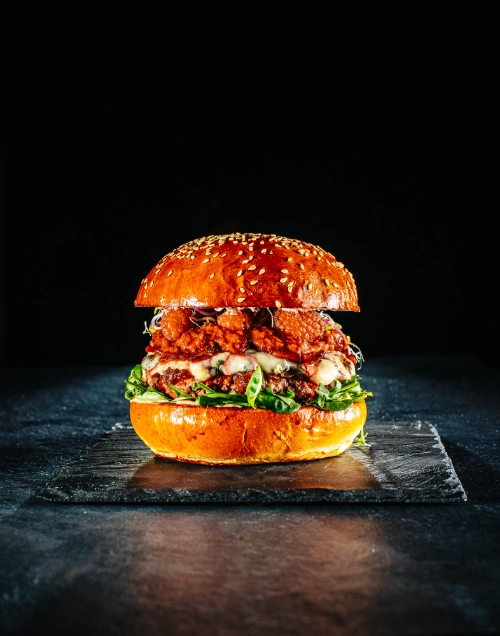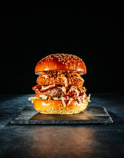 100% wołowiny/ bekon/ ser smażony w panko home made/ ser mimolette/ sałata lodowa/ pomidor malinowy/ ogór kiszony/ jalapeno/ sos ostry