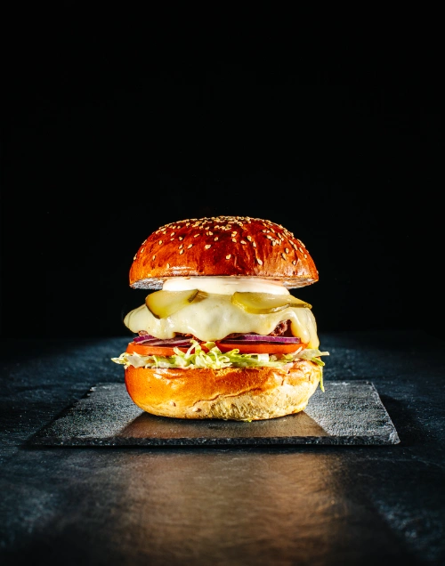 100% wołowiny/ cheddar/ sałata lodowa/ pomidor malinowy/ cebula/ ogór kiszony