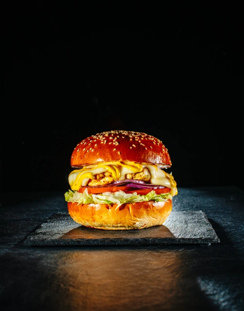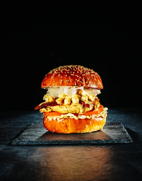 100% wołowiny/ ser smażony w panko homemade/ bekon/ prażona cebulka/ sałata lodowa/ pomidor malinowy/ sos colorado