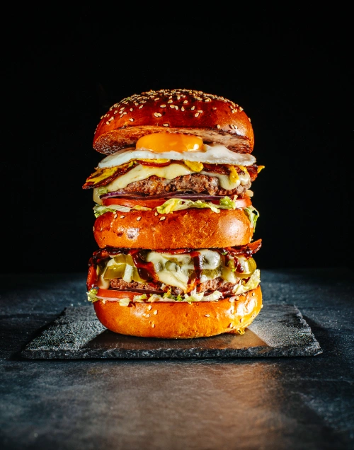 2 x 100% wołowiny/ 2 x bekon/ 2 x cheddar/ jajo/ jalapeno/ 2 x sałata lodowa/ 2 x pomidor malinowy/ 2 x cebula/ american sos/ sos Jack Daniel’s BBQ