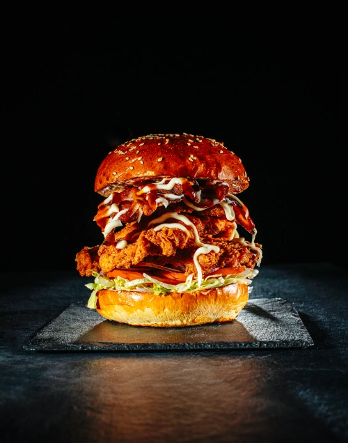 KFC/ bekon/ sałata lodowa/ cebula/ pomidor malinowy/ ogór kiszony/ sos autorski