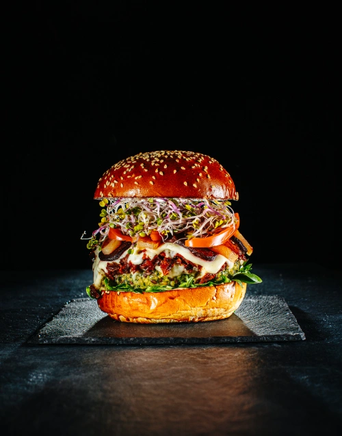 100% wołowiny/ bekon/ ser mimolette/ sałata lodowa/ cebula/ pomidor malinowy/ ogór kiszony/ sos autorski
